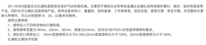 ZK-19/32A型组合式气动钢带主要用于捆扎包装彩色卷板和外包装使用木箱的产品,也适用于木制品业、造纸业、玻璃制造业的产品捆扎包装。其特点是以操作者的双手为动力,操作灵活方便、快捷。适应任何场地作业。本机不使用锁扣、降低了包装成本。